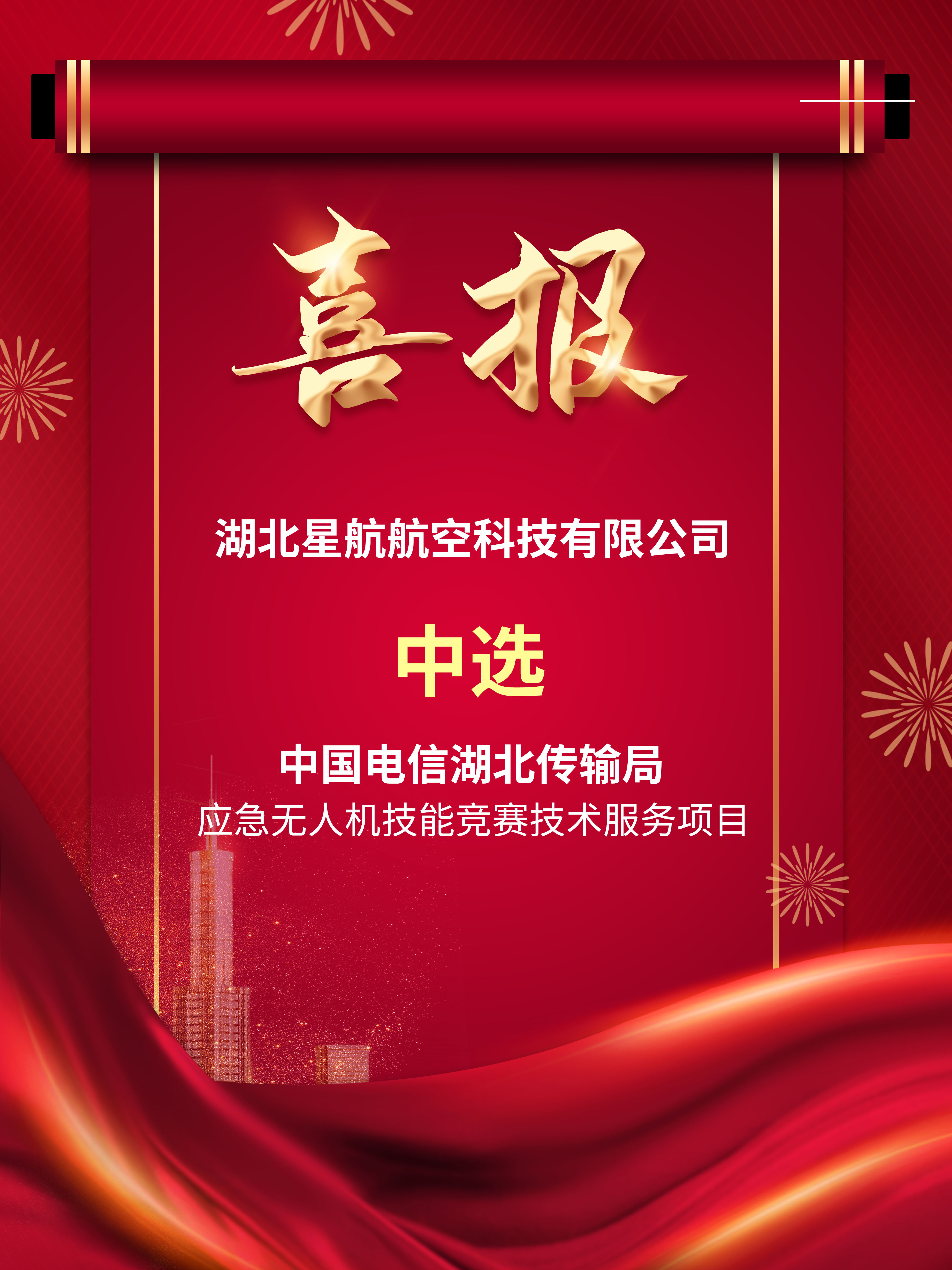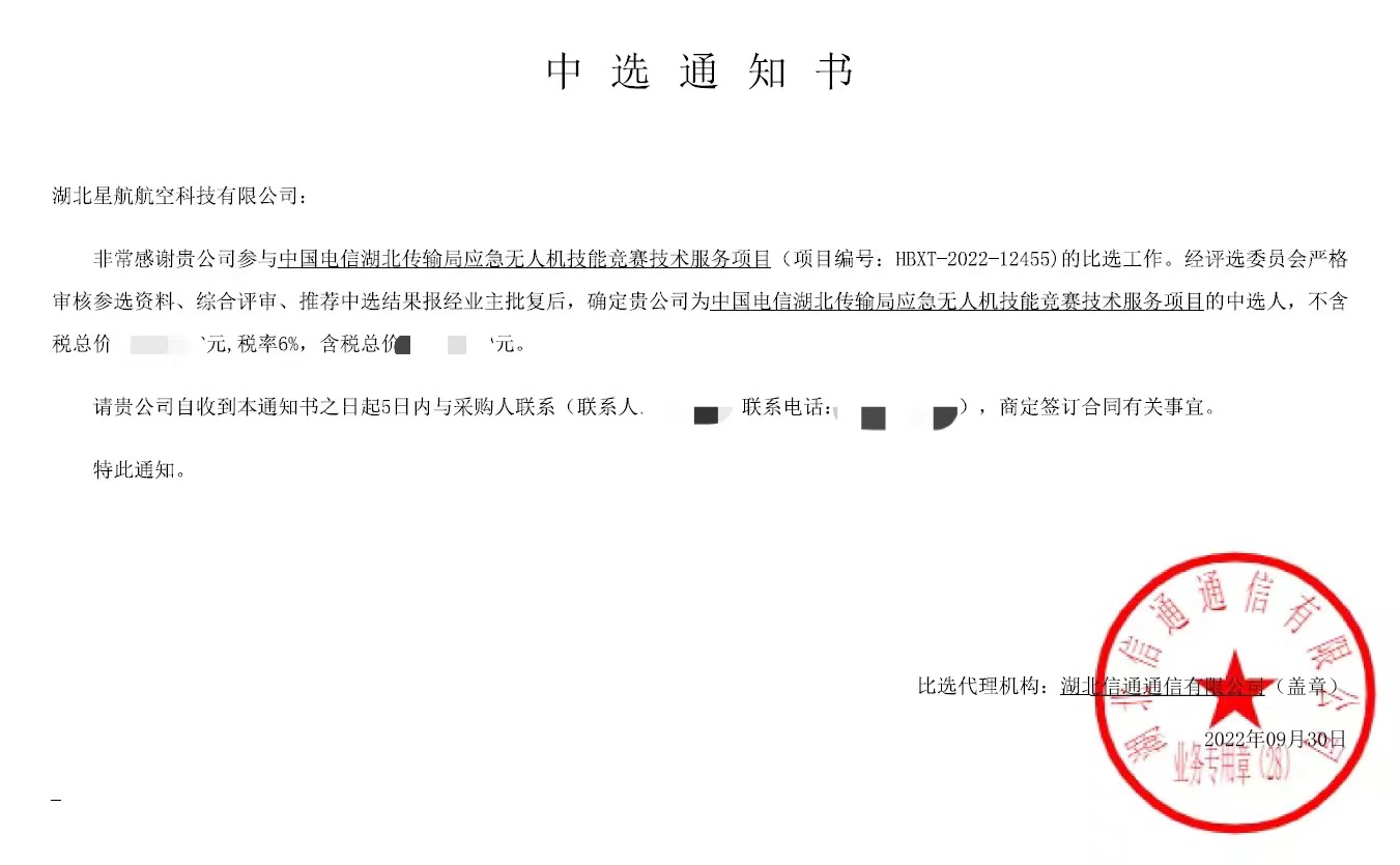 【概要描述】經評選委員會嚴格審核參選資料、綜合評審、推薦中選結果報經業主批復后,確定湖北星航航空科技有限公司為中國電信湖北傳輸局應急無人機技能競賽技術服務項且的中選人。